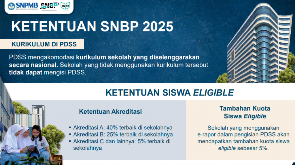 - Sekolah yang mengikutkan siswanya dalam SNBP harus mempunyai Nomor Pokok Sekolah Nasional (NPSN) dan mengisikan rapor siswa yang eligible di Pangkalan Data Sekolah dan Siswa (PDSS) dengan lengkap dan benar.