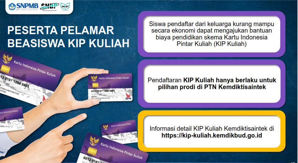 - Siswa pendaftar dari keluarga kurang mampu secara ekonomi dapat mengajukan bantuan biaya pendidikan skema Kartu Indonesia Pintar Kuliah (KIP Kuliah).