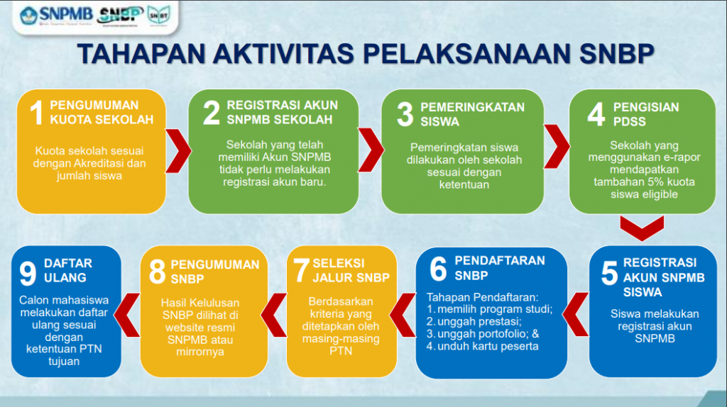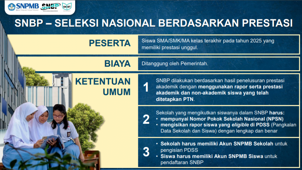 - Siswa yang akan mendaftar SNBP disarankan membaca informasi persyaratan program studi pilihan pada laman PTN yang dituju.