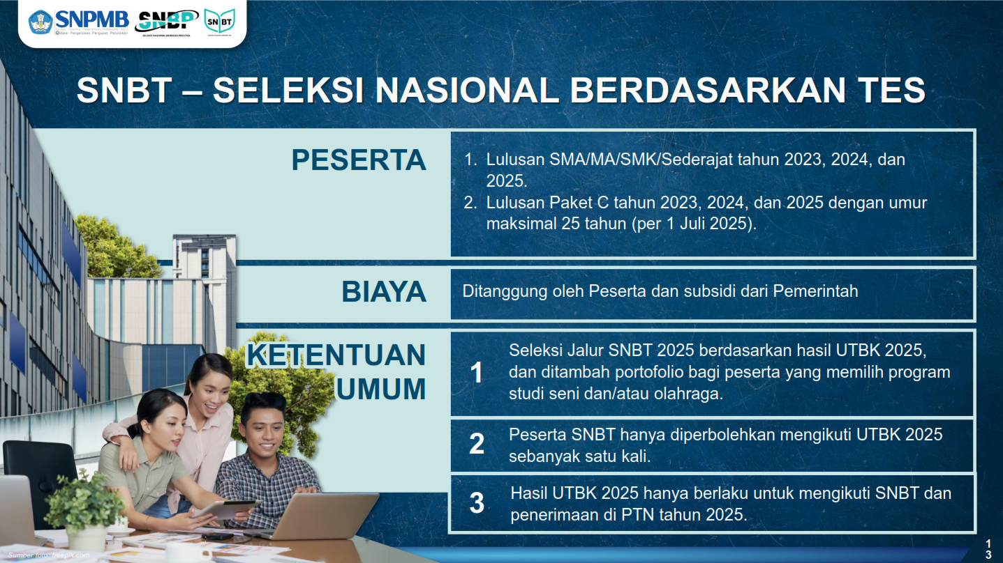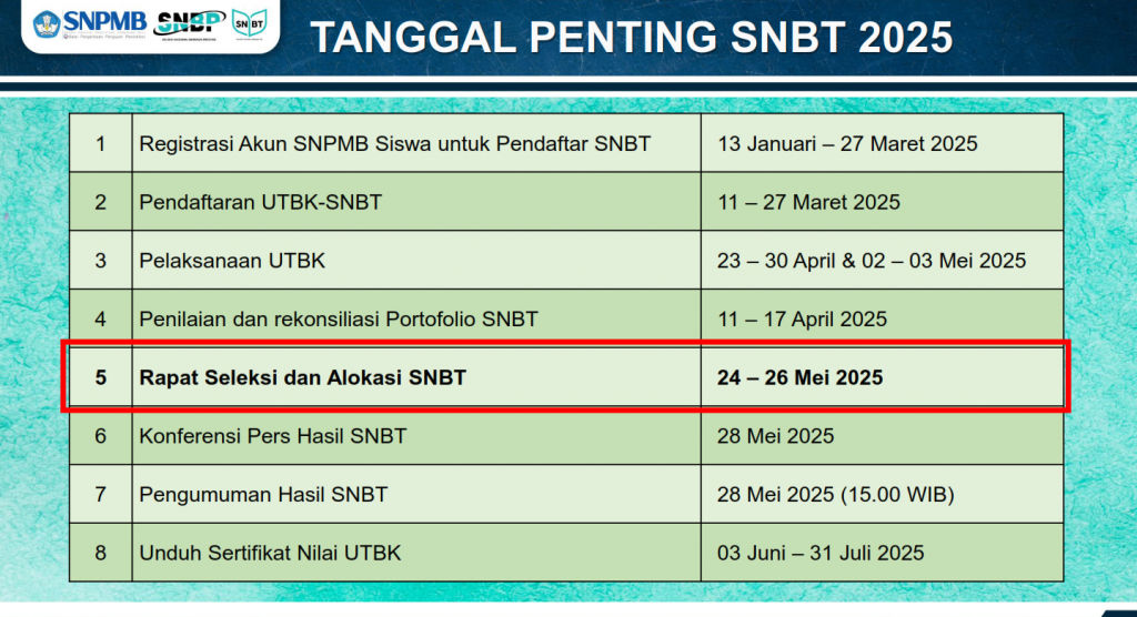 - Siswa yang telah dinyatakan lulus seleksi Jalur SNBP 2025, SNBP 2024 dan Seleksi Nasional Masuk Perguruan Tinggi Negeri (SNMPTN) 2023 tidak dapat mendaftar UTBK-SNBT 2025.