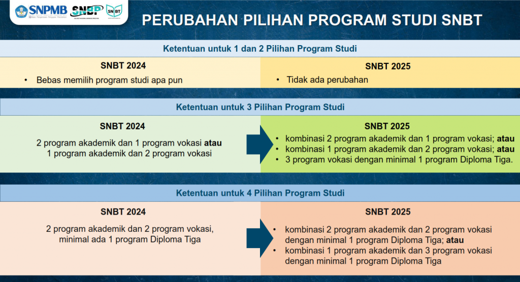 - Setiap siswa yang eligible diizinkan memilih Prodi di PTN Akademik, PTN Vokasi, dan/atau PTKIN.