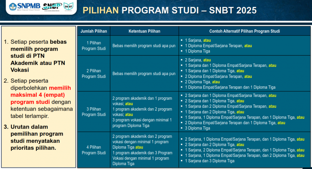 - Setiap peserta bebas memilih program studi di PTN Akademik, PTN Vokasi, dan/atau PTKIN.