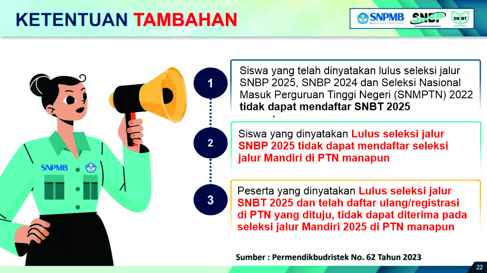 - Siswa yang dinyatakan lulus seleksi Jalur SNBP 2025 tidak dapat mendaftar seleksi Jalur Mandiri di PTN manapun.